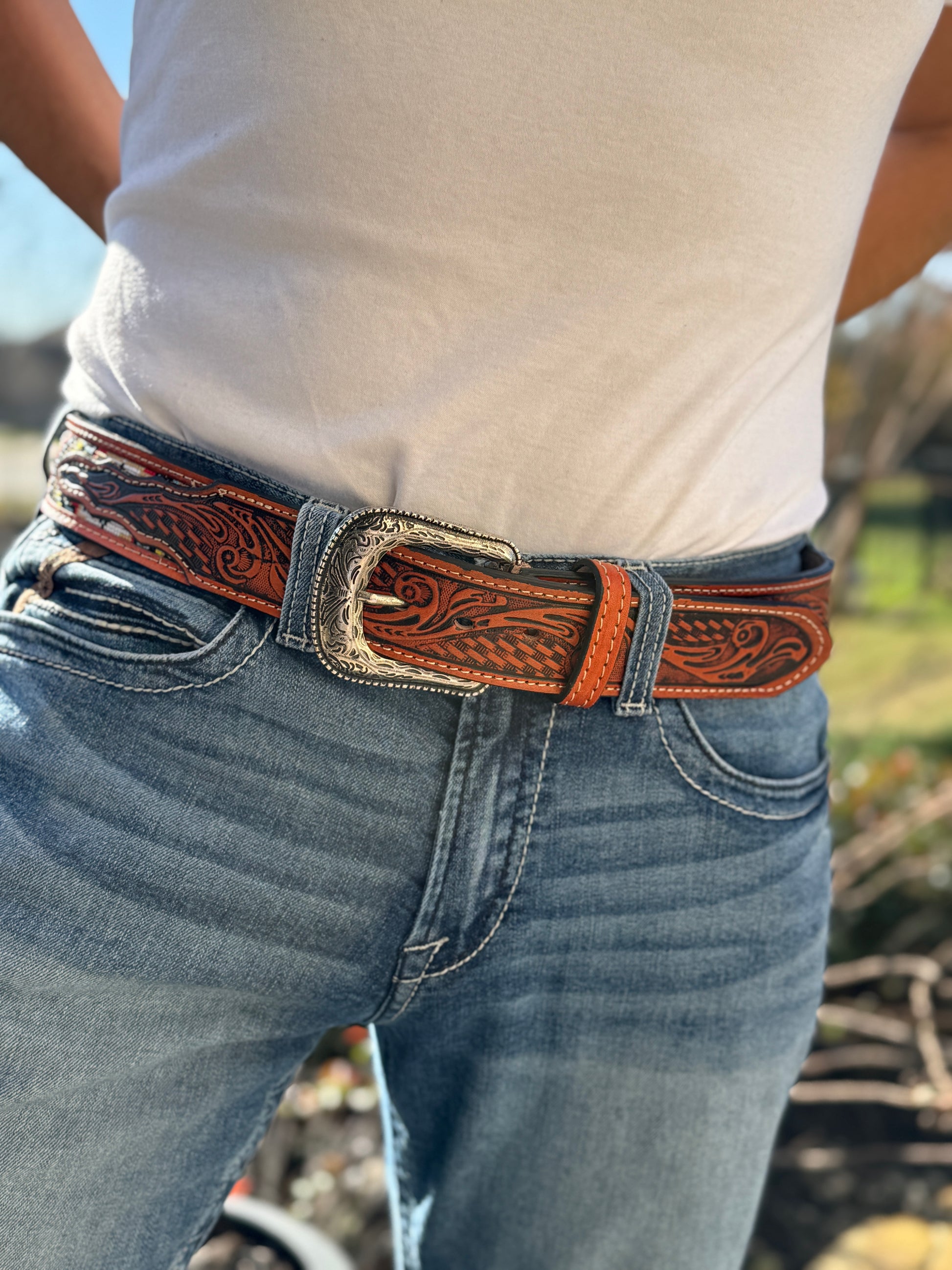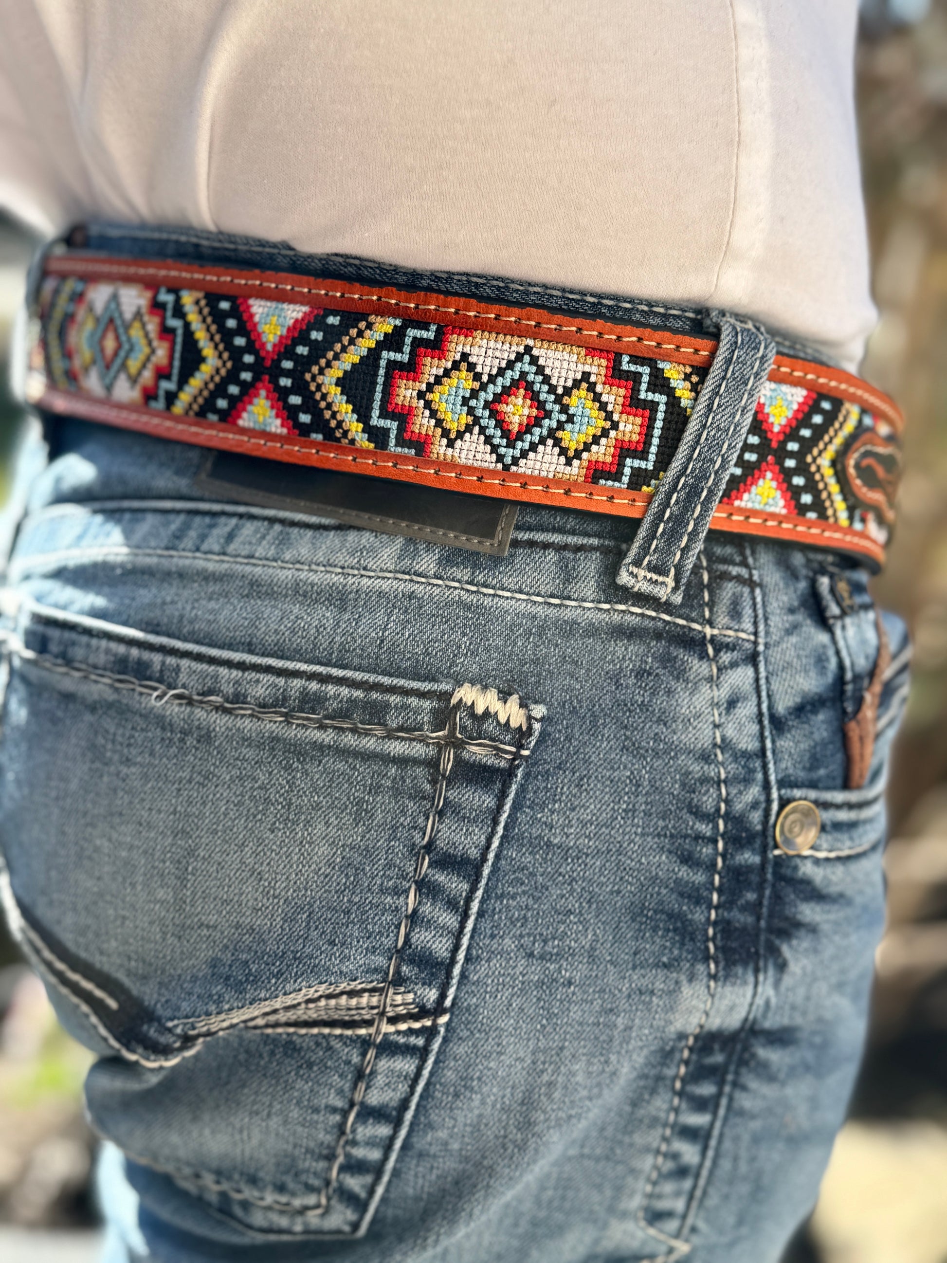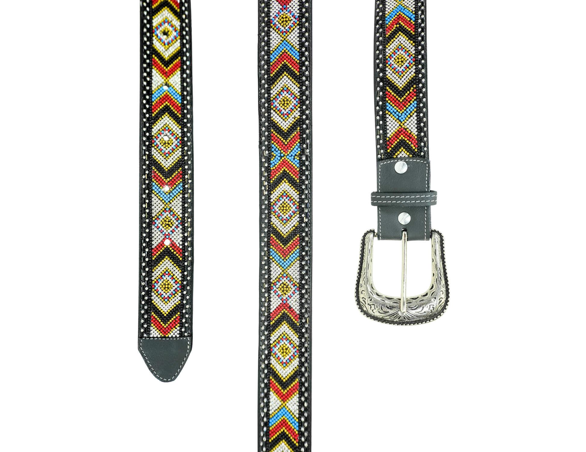 Meticulously handcrafted and adorned with vibrant, multicolored tiny stones, this exquisite piece is finished with a Western-style leather lining, creating a perfect fusion of artisanal craftsmanship and rugged charm. Product Features: