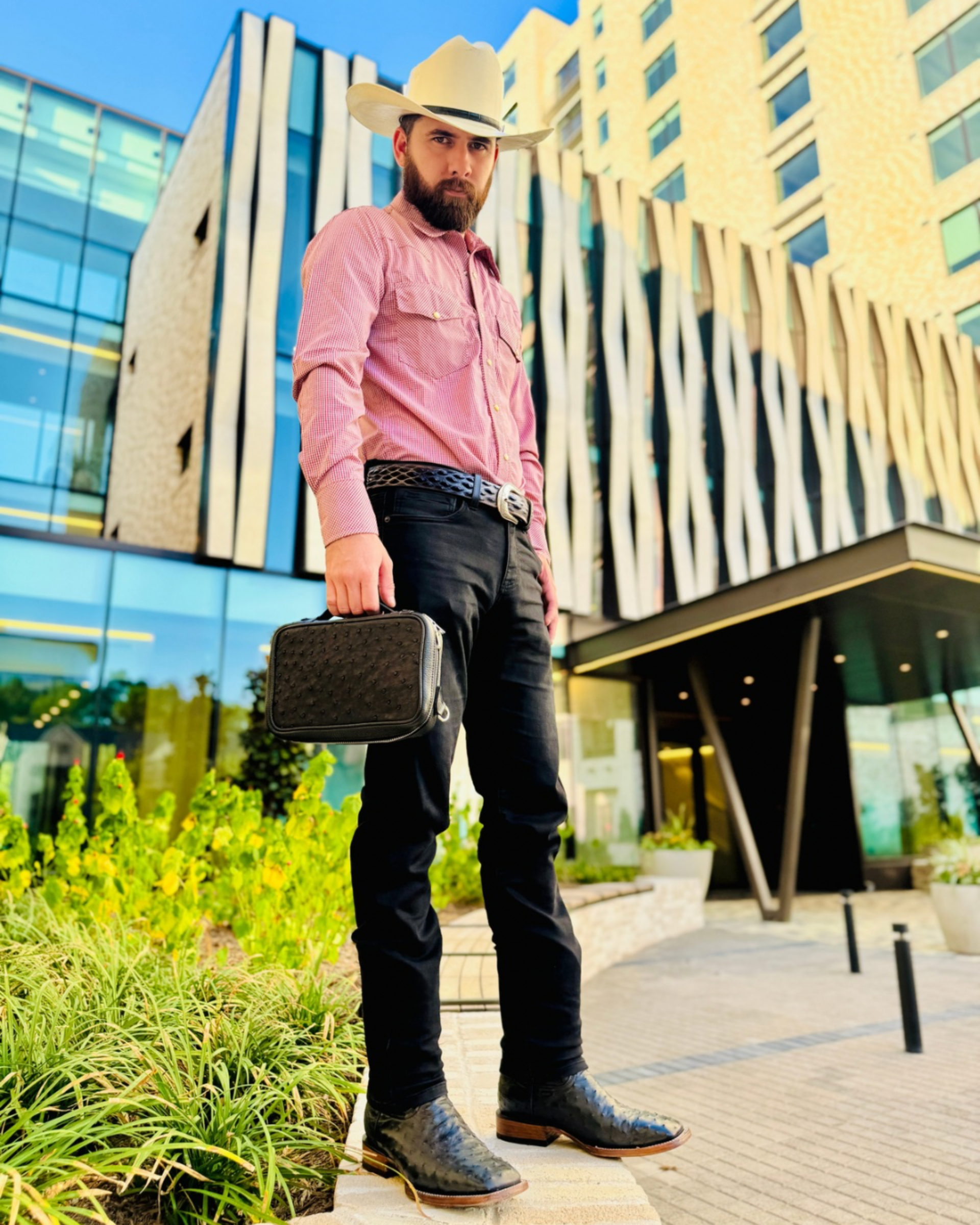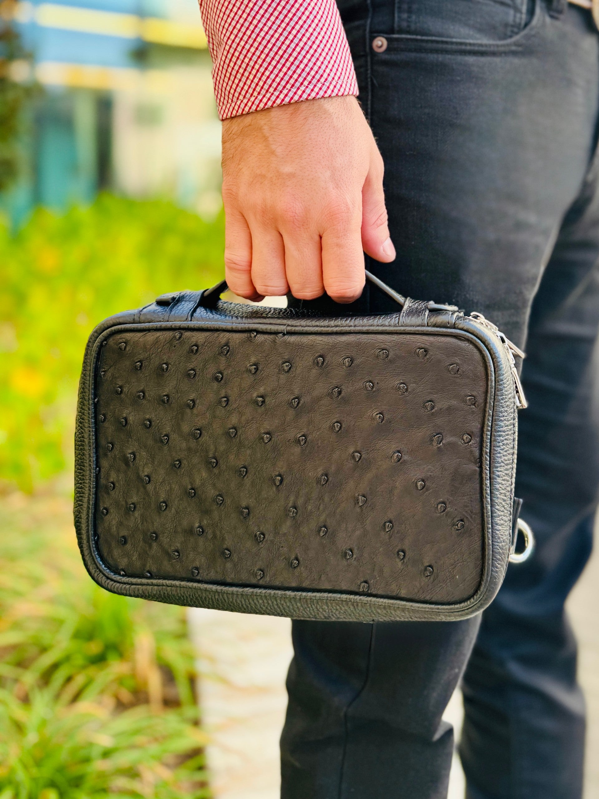 Discover the perfect blend of elegance and practicality with this Black Ostrich Travel Bag. Crafted from genuine cowhide leather with a luxurious ostrich leather front panel, this bag stands out for its unique texture, durability, and sophisticated finish.
